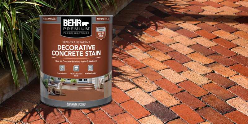 BEHR PREMIUM FLOOR COATING: Semi Transparent Decorative Concrete Stain for Concrete Pavers, Porches & Walkways. For interior/Exterior - Weather Resistant Finish - Acid Free Formula. Photo shown is stained and sealed.